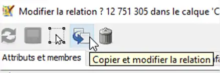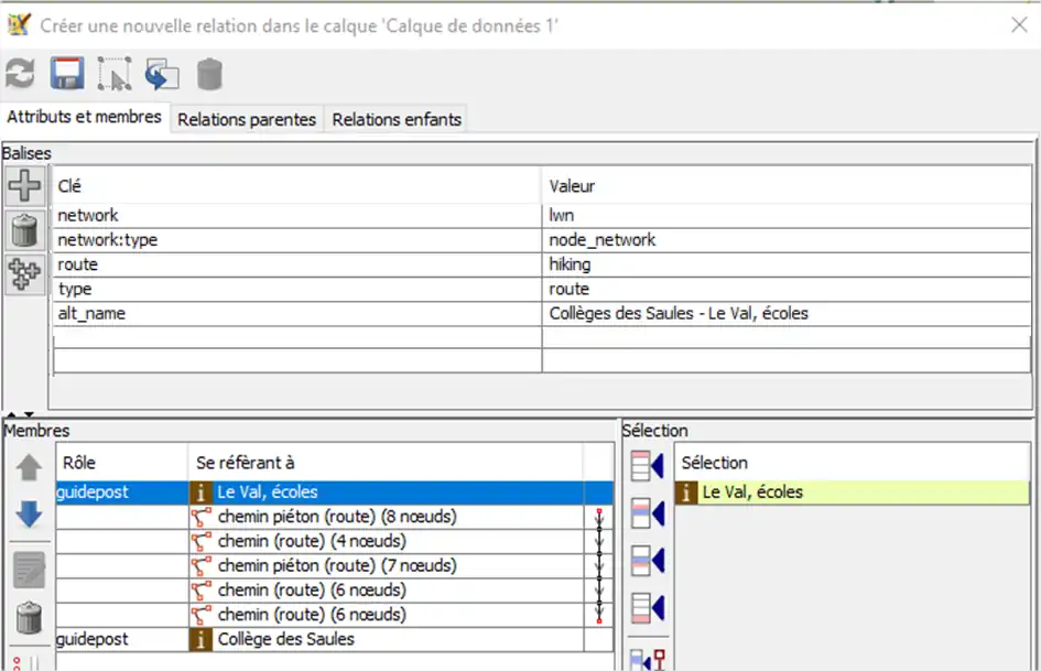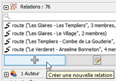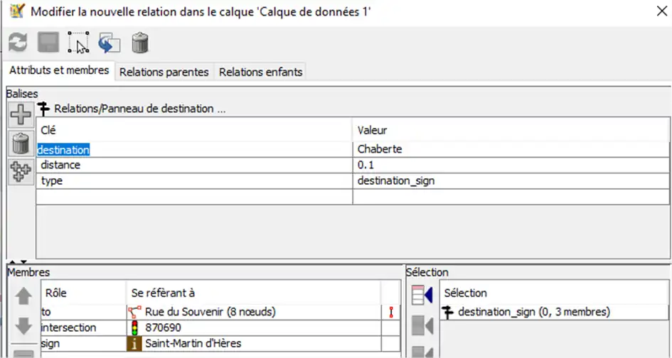 Modifier cette relation pour ajouter les carrefours et les itinéraires. Pour les itinéraires on peut utiliser la recherche de relation et double-cliquer dessus. Pour minimiser le nombre de recherche, on peut chercher un carrefour sur 2.