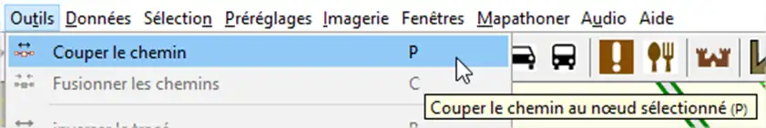 On fait de même avec les autres panneaux d’itinéraire de ce départ. Il faut ensuite ajouter les chemins/routes en partant de ce départ jusqu’à la destination de cette route. Pour cela on peut avoir besoin de découper des chemins en utilisant le menu suivant :
