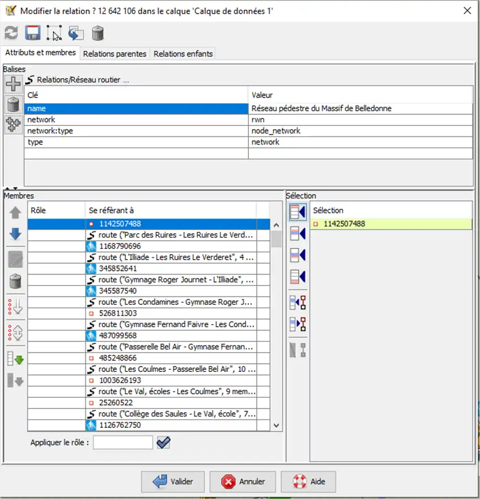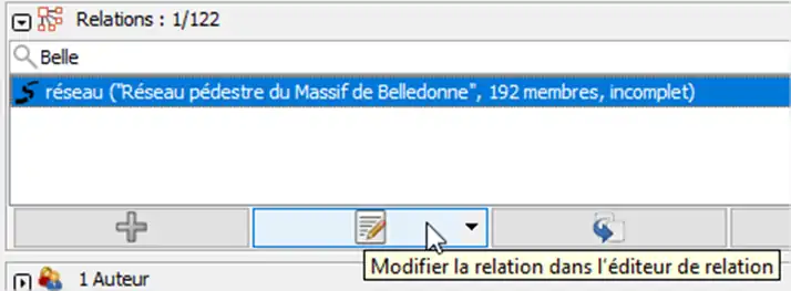 Le réseau de carrefours est aussi une relation. Dans notre exemple il s’agit du Réseau pédestre du Massif de Belledonne qu’on trouve en faisant une recherche panneau droite des relations.