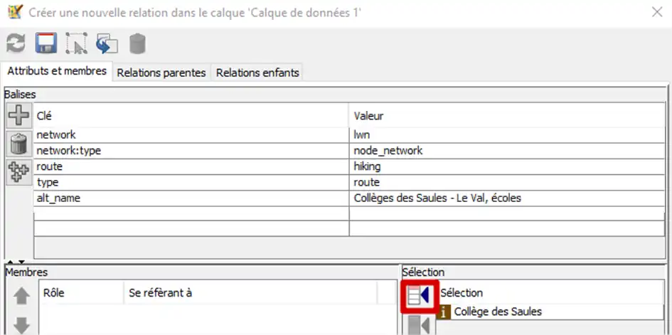Sélectionner ensuite un panneau d’itinéraire de départ sur la carte, il apparaît dans la sélection de la relation. Mettre ce nœud dans les membres de la relation en cliquant sur le bouton encadré de l’image suivante.
