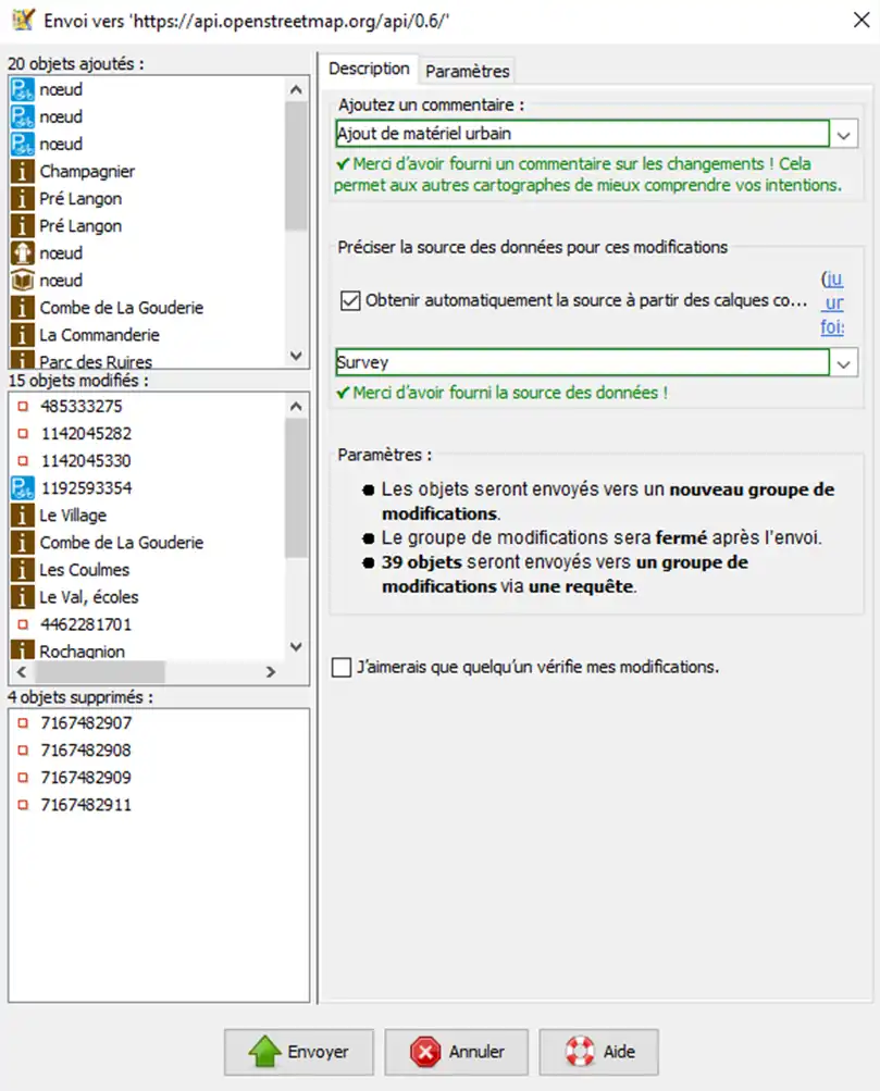 S’il n’y a plus de soucis à corriger, on continue l’envoi et on arrive sur la fenêtre où on doit ajouter un commentaire décrivant nos modifications pour permettre à d’autres de comprendre ce qui a été fait, ainsi que la source (ici Survey pour une étude sur le terrain).