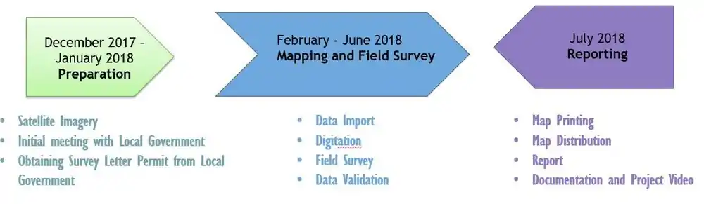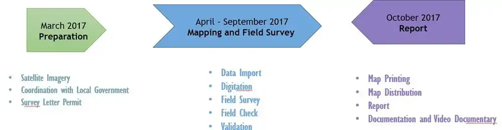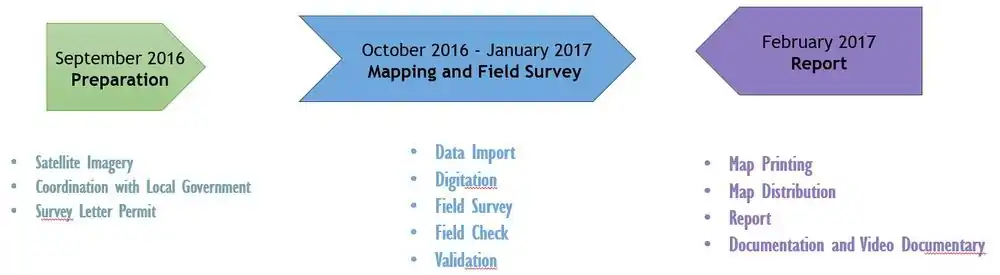 As have been mentioned above, Surabaya, Semarang and DKI Jakarta have different area size. Therefore, it determines how long the mapping activity going. Surabaya with a smaller area than the others area took around 5 months for its field survey area to be completed with the total duration was 6 months. The picture below shows Surabaya Mapping Timeline: