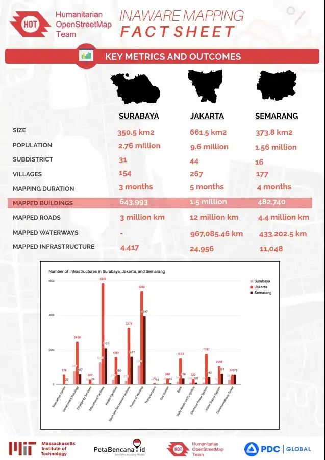 This project has been mapped in 3 cities in Indonesia. The first city was Surabaya (October 2016 - February 2017), the second city was DKI Jakarta (March - November 2017), and the third city was Semarang (February - July 2018). These mapping activities were done by the Humanitarian OpenStreetMap Team (HOT) Indonesia with cooperation and support from the local government such as city government and local disaster management agency (BPBD).