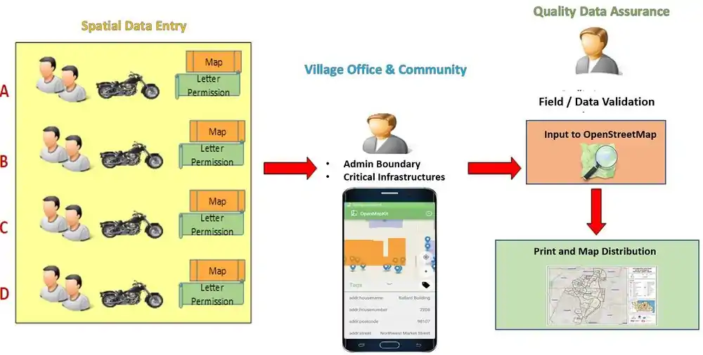 Third step is Field Survey using OpenDataKit (ODK) Collect and OpenMapKit as a GPS and Printed Survey Form replacement. The team go to the field using motorcycle and survey all infrastructures in their area as well as asking village office representative to update the administration boundary. The process for field survey can be seen in picture below: