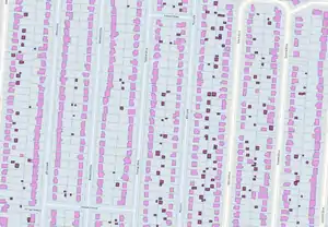 Next we move to parcels that match to multiple buildings. Most of these contain minor outbuildings like sheds or garages that are subsidiary to a major building like a house. We want to assign an address only to the major (largest) building in these cases. Some large parcels have many buildings (e.g. > 20), so in this step we only look at parcels with 2 or 3 buildings.