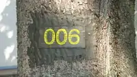 Bäume im Stadtgrün der Landeshauptstadt Hannover (LHH) wie in der Kopernikusstraße sind ggf. straßenbezogen durchnummeriert. Sie tragen eine dreistellige Zahl gelb auf grün/braun. Die Nummerierung muss nicht durchgängig sein, sondern kann auch nur am ersten und letzten Baum angebracht sein. Im Ausnahmefall - wahrscheinlich verdichtende Nachpflanzung - ist mehreren Bäumen die selbe dreistellige Zahl vergeben und diesen eine zweite Zeile mit einer zweistelligen Zahl mit "01" beginnend hinzugefügt. Dies sollte ref=NNN/NN (s. 24220612352422061235) getagged werden.