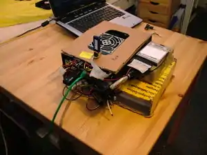 Together with the CPU hard at work the Computer manages to draw about 25 W or about 2 Amps from the battery pack (12 V, 28 Ah) of rechargeable lead gel batteries.
