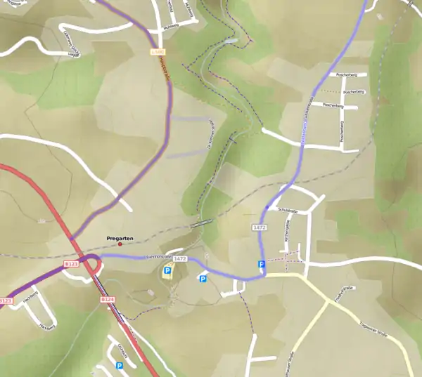 This image shows, how some of the possible tagging variations of paths are rendered. In the valley going south from the middle of the top of the image, you can see a path tagged as foot=designated and bicycle=yes, but without a surface tag (dashed blue-salmon). In the city center of Pregarten, slightly to the south-east of the image center, you can see renderings of paths with surface=paved, foot=designated, and bicycle=designated. The blue dotted cycleway across the bridge in the south-west is a traditional highway=cycleway.