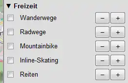 Das + auf grauem Hintergrund öffnet das wichtigste Werkzeug der Karte: die Ebenenauswahl. Hier können Kartenebenen (Layer) und Werkzeuge an- oder abgeschaltet werden.