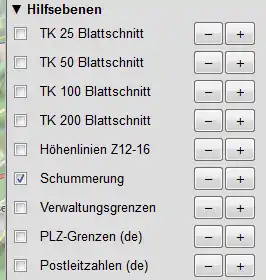 Es gibt einige Hilfsebenen wie Höhenlinien, Schummerung, Verwaltungsgrenzen und das Raster von amtlichen topographischen Karten.