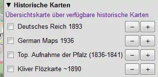 Eine wachsende Zahl an historischen Karten kann als Overlay ausgewählt werden. Es werden nur die historischen Karten angezeigt, die im Kartenausschnitt verfügbar sind. Der Link 'Übersichtskarte über verfügbare historische Karten' öffnet ein neues Fenster, in dem die Bereiche aller historischen Karten farbig angezeigt werden.