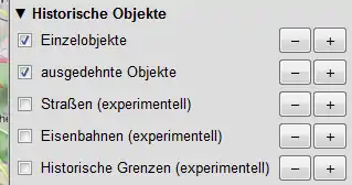 Man kann auswählen, welche Arten historischer Objekte angezeigt werden sollen. Standardmäßig sind das Einzelobjekte (Punktobjekte) und ausgedehnte Objekte (Linien- und Flächenobjekte). Zusätzlich gibt es einige experimentelle Ebenen für historische Straßen, Eisenbahnlinien und Grenzen. Diese sind u.U. nicht dauerhaft verfügbar.