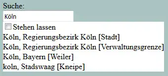 Gib den Suchstring ein und drücke die 'Enter'-Taste. Es öffnet sich eine Liste mit anklickbaren Suchergebnissen. Man kann mit dem Häkchen 'Stehen lassen' erreichen, daß die Suchergebnisse offen bleiben (um z.B. ein anderes Ergebnis anklicken zu können).