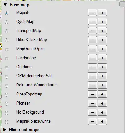The base map is the background map style, it defaults to the classic OpenStreetMap Mapnik style. Select to your convenience. Only one base map can be selected at a time.