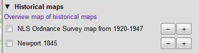 An increasing number of historical maps is available as overlays. The maps shown depend on the current map area. Only historical layers that are visible in the current map area are shown in the layer changer. The link "Overview map of historical maps" opens up a new window with all historical maps available in a graphical representation.