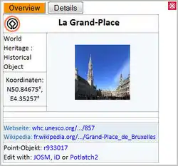 A thumbnail preview image can be displayed in the popup window. Clicking on the thumbnail will open the full sized image in a separate browser window or tab. The image is chosen from one of the links image=* or wikipedia=* alternatively. If there's no appropriate image available a placeholder will be shown with the hint "Do you want a photo? Get involved!".