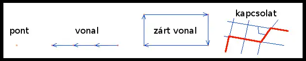 - Vonalak (way): pontok vonalszakaszokkal összekötve. Utak és egyéb vonalas objektumok megrajzolására használjuk.