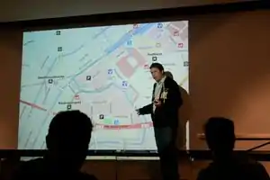 ![]() Steve Coast bemutatja az OpenStreetMapet Az OpenStreetMap (OSM) egy szerkeszthető térkép az egész világról, amely nagyrészt közösségi erővel készül, és szabad tartalom licenc alatt használható fel. A projekt azért indult, mert a legtöbb térkép, amiről azt gondolnád, hogy szabad, valójában szigorú jogi vagy technikai megkötéseket tartalmaz a használatára vonatkozóan. Ez lehetetlenné teszi a kreatív és produktív felhasználásokat. Erre a célra utal az OpenStreetMap angol kifejezés, ami magyarul „nyílt utcatérképet” jelent. Az OSM-ről bővebben lásd a magyar Wikipédia szócikkét. Szabad licencAz OpenStreetMap licenc szabad (vagy majdnem szabad) hozzáférést biztosít a térképeihez és minden mögöttes térképadathoz, és a projekt célja, hogy elősegítse ezen adatok új és érdekes felhasználását. Hogy miért szeretnénk szabad tartalmú térképet, és a választ a leggyakrabban feltett kérdésre: „Miért ne a Google Térképeket használjam?”, lásd a GYIK(en) oldalon. Térképkészítés![]() Takaosan térképező parti (Tokió, Japán, 2010 októbere)