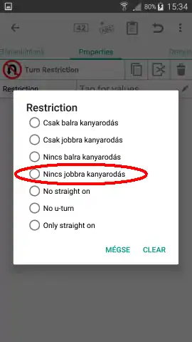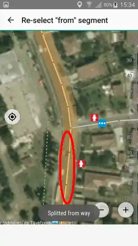 Hiányzó fordulási tiltás rögzítéséhez először jelöljük ki az utat, majd az ábrákon látható módon hozzuk létre a tiltást. Nem szükséges előre feldarabolni az utat ha a fordulási pontban nincs megszakítva, a pont kiválasztása után a program darabolja azt, majd megkérdezi hogy melyik útszakaszt akarjuk használni (Re-select "from" segment)