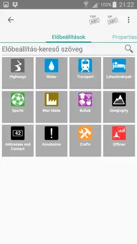 A címkék szerkesztésére több módunk is van. Ha kategóriákba rendezett ikonok közül akarunk választani, használjuk az Előbeállítások fület. Egy szintet az UP ABC gombbal, a főmenübe a TOP ABC gombbal léphetünk vissza. Használjuk bátran az 'Előbeállítás kereső szöveg' mezőt, mivel eleinte nehéz lesz megtalálni hogy melyik kategóriába soroltak egy adott POI-.t