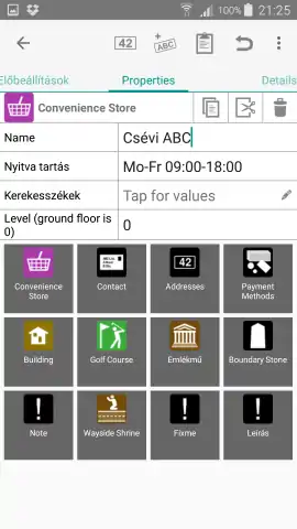 A Properties fülön a kiválasztott ponthoz tartozó sablon szerinti mezők jönnek fel, például egy bolthoz tartozik nyitvatartási idő, név, megközelíthetőség kerekesszékkel.