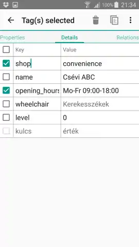 Végül ha gyakorlott OSM felhasználók vagyunk a Details fülön közvetlenül szerkeszthetjük a címkéket, vagy esetleg itt ellenőrizhetjük, hogy mit eredményeznek az előző lapokon kiválasztott értékek. Szerkesztés közben a címkék áthelyezéséhez mindenhol elérhető a vágólap a jól ismert ikonok használatával. ![]()