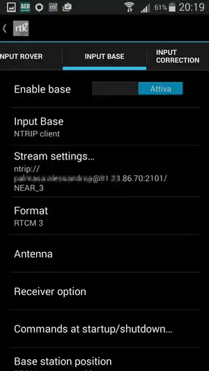 - Settings -> Input streams -> Input base (qui i dati per la connessione via internet allo stream dati per la correzione) 'attiva', Input Base 'NTRIP client' Stream settings '(qui impostiamo i dati a seconda della rete di correzione, avremo un IP address da inserire nel campo Host, Port '2101', NTRIP Mountpoint '(variabile a seconda della rete, cercare NEAR o NEAR_3 o NEAREST), NTRIP user e password sono quelle che avete scelto all'atto della registrazione al servizio NTRIP, Format '(nel 99% dei casi sarà RTCM3, anche qui dipende dalla rete regionale)', gli altri campi non li configuriamo.
