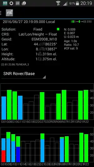 Collegate l'antenna e l'alimentazione al modulo GPS, collegatelo allo smartphone e su Server selezionate ON, spostatevi poi su Status: selezionando SNR Rover/Base vedrete nella riga superiore i satelliti agganciati dal GPS e, se avete impostato correttamente i dati per l'accesso alle correzioni via rete, in basso gli stessi satelliti (con la potenza ricevuta dalla stazione fissa di correzione). In caso di errore nelle impostazioni dello stream di correzione vedrete apparire un messaggio 'connecting ...' o 'unauthorized', in tal caso verificate le impostazioni ed eventualmente modificate il NTRIP Mountpoint