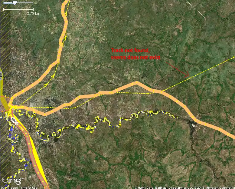 The overlapping between OSM and WRI shows the latter in quite inaccurate, but allows to find the missing roads and even more the missing tracks. It is even possible to trace them over the low res Bing Imagery (made from 30m resolution LandSat imagery), as seen below: