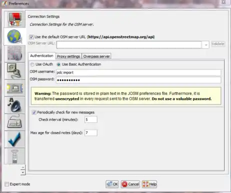 - Now you are ready to import the nodes to OSM. As we will import these nodes with the special OSM import account, we need to make sure that we changed the user in the preferences (F12):