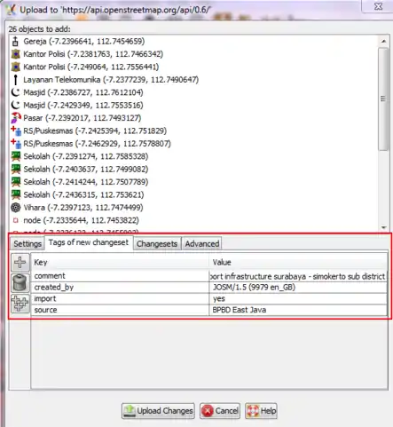3. Check the properties tag the objects. The tags have to define OpenStreetMap. For example, school in OpenStreetMap has tag amenity=school; mosque = amenity=place_of_worship, religion=muslim; marketplace = amenity=marketplace.