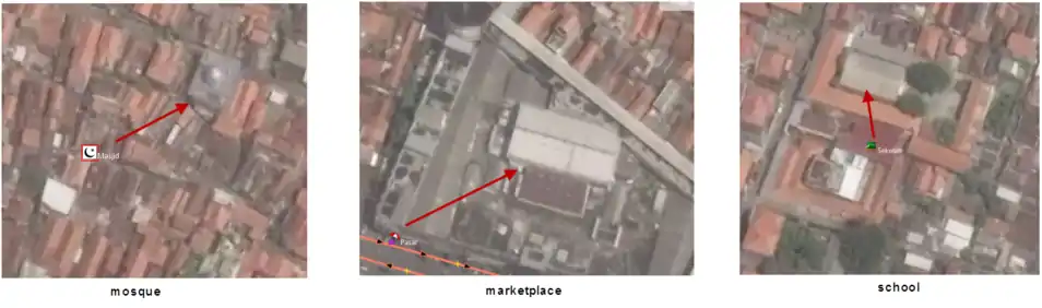 1. Check the location of the node. The location of the infrastructure nodes are generally quite correct, but not perfect. Some of the nodes may be as far as 150 m away from the actual position, but spotting infrastructure nodes in Indonesia is generally easy. They have a specific building, such as school, mosque, and marketplace. For the screenshot in below (image 1), we can see that mosque point is displaced 51 m to the North from its actual location, so we move it and place it at the center of the building mosque.
