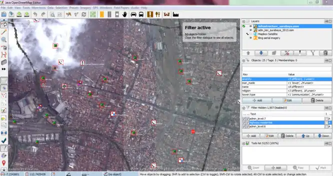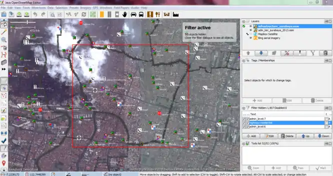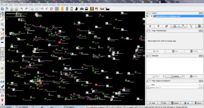 Our project is to import the infrastructure features data in Surabaya into OpenStreetMap. These data were collected from BPBD (Regional Disaster Management Agency) East Java, based on UTM 49S. The original dataset consists of 4.915 infrastructure features nodes. The infrastructure features include buildings, places of worship (mosques, vihara/temples, and churches), schools, hospitals, government offices, cemeteries, marketplaces, monuments, towers, communication towers, post offices, and factories.