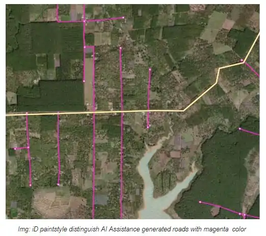 - The Mapper evaluates the roads we generated (styled in a different color) and inspect them for issues like crossing highways, disconnected roads, incorrect intersections, short road stubs, road types, etc., and fixes these issues manually one by one, using Maxar satellite imagery.