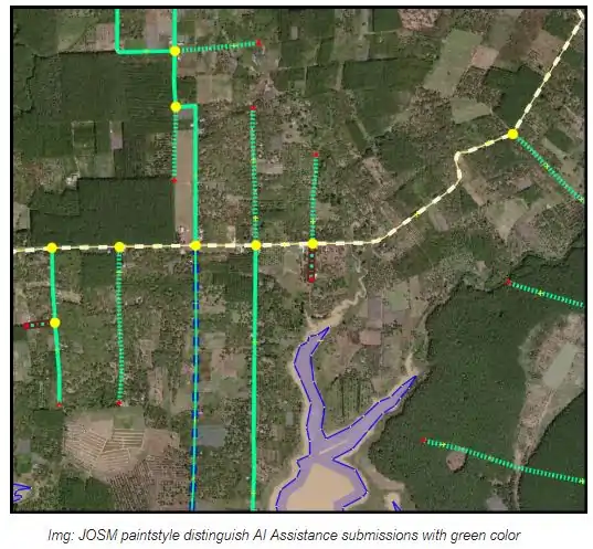- A custom JOSM paint style is used to help distinguish our submissions from community submissions, so that all roads with the source=digitalglobe tag are highlighted in green.