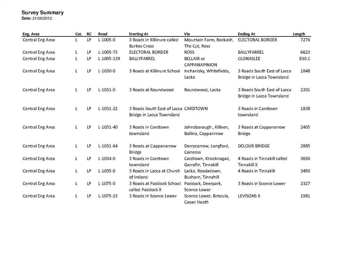 | Central | L-1034-0 | 3 Roads in Cardtown townsland | Cardtown, Knocknagad, Garrafin, Tinnakill | 4 Roads in Tinnakill called Tinnakill X | 3650 | 100% | AndrewMcCarthy 00:36, 30 September 2012 (BST) | |