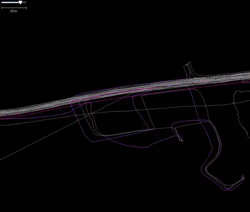 ピンクの軌跡は事情が違います。異なる GPS 機器で採取され、信号が弱いときに得られる典型的な軌跡を示しています(他の GPS と並べて取ったものなので、単に動作が悪いだけでしょう)この問題は、角を曲がるときに特にはっきり分かります。角を曲がってもすぐに曲がったことが反映されず、しばらくの間は曲がる前の方向に動き続けたかのような軌跡を示した後、方向転換しています。