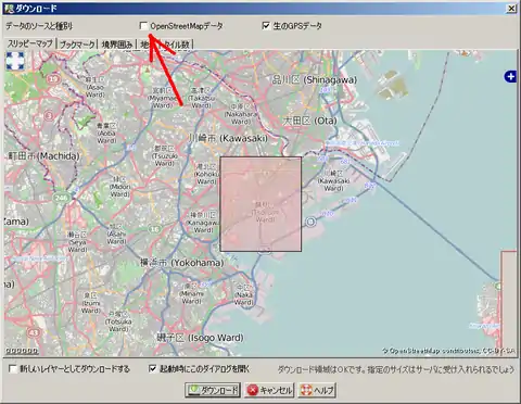 - JOSMメニュー⇒[ファイル]-[OSMからダウンロード...]を実行してください。この時に「OpenStreatMapデータ」のチェック項目を外してダウンロードするのがいいでしょう。