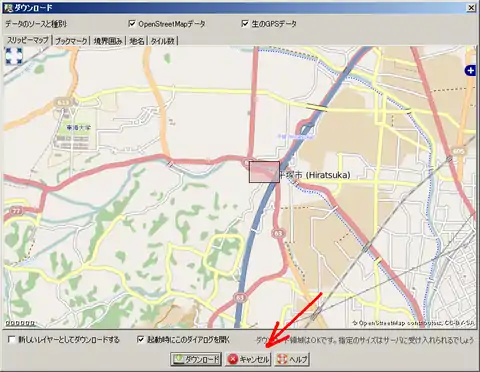 - JOSM起動時のダウンロードパネルが表示された場合には「キャンセル」をクリックして閉じてください。
