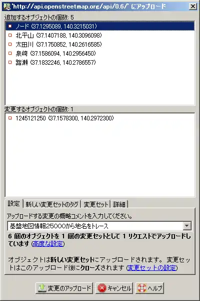 - すべてのノードに名称を設定し終えたら、「データをアップロード」を行います。この時に表示されるパネルの「追加するオブジェクトの個数」のフィールドに「ノード」と表示されるものが無いことを確認してください。