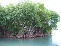 マングローブは、沿岸部の湿地帯で、汽水や塩水の中で耐塩性の樹木、低木、その他の植物が生育しているのが特徴です。 | ![]() |