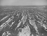 String bog や Strong mire と呼ばれるのは、木本植物が生えわずかに盛り上がった畝・島状の部分と、草本植物の生える細長い湿地が交互にあるような地形です。String bog は、わずかに傾斜した地表に、水の流れに沿った方向の凹凸があるところに形成されます。 | ![]() |