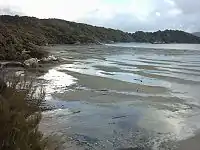 潮間帯に堆積物がたまって生じる湿地。この種の湿地には多数の鳥、カニ、軟体動物がいる。干潟(Wikipedia)を参照してください。