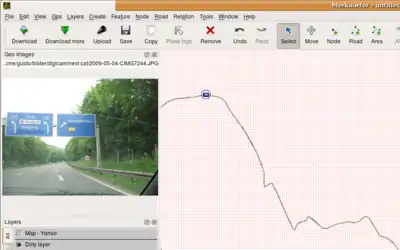 You can insert a new node into an existing way to give it a smoother path or to otherwise add a detail to it. Again, use the menu command "Create, Node" and put the mouse cursor on the location where the new node shall be inserted. When hovering an existing way segment, it is highlighted. Now you can click on the path to insert the node into that way. The new node is automatically inserted into the way and moving the node around will also modify the way path.