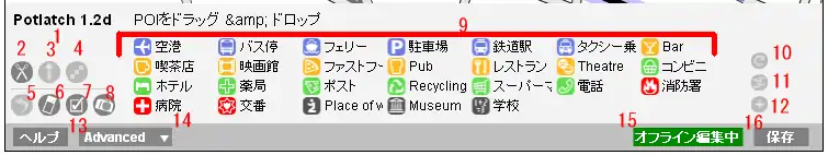 パネルには種々の情報や地図に貼り付けるアイコンの一覧などが表示されています。Potlatchのバージョンによってここに表示されるものは多少変わりますが、おおよそ下記のようになります。