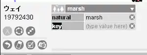 では実際にクリックしてみましょう。すると、右図のように選択した部分の色が変わります。また、パネル部分も変化します。このデータの場合、タグとしてはnatural、そのデータはmarshのみが定義されています。言い換えれば名前が定義されていません。そこで、このデータにnameという、名前を表すタグを付与してみましょう。この作業を行うためには、パネル上の丸で囲まれた+アイコン(新しいtagを追加)をクリックします。