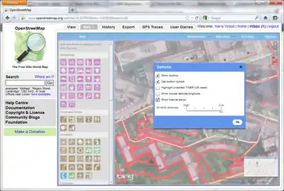 - Potlatch 2 ではこれはオプション機能として提供され、有効化することができます。Remapping#Potlatch 2を参照。 http://wtfe.gryph.de/ のサービスを使ってライセンスデータレイヤを生成しています。詳細は下記の#Potlatch 2 を参照