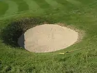 | バンカー。グリーンやフェアウェイの近くにある窪地で、ふつうは砂に満たされています。 |