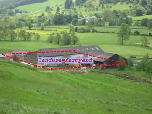 農場内の家屋、住居、倉庫、厩舎、納屋、物置小屋、サイロなどの建物、加えてそれらの間のオープンスペース、および周りの木々や植え込みなどの部分をタグ付けする時は、 landuse=farmyard を使用してください。