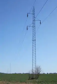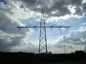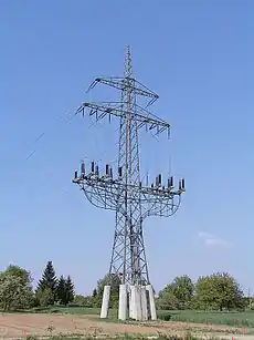 design donau 2段式の鉄塔の一種です。上段の腕金には両側に1本ずつ、下段は両側に2本ずつの送電線を持つのが特徴です。中央ヨーロッパでは "ドナウ鉄塔" と呼ばれています。